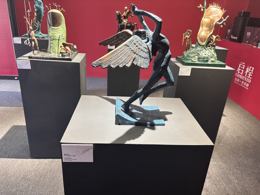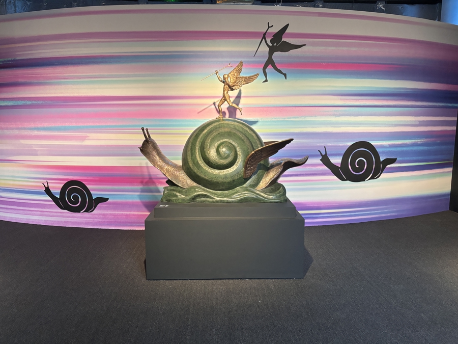 雕塑《蜗牛与天使》呈现在达利艺术生涯中占据重要地位的另一意象——蜗牛,这幅作品打破蜗牛“缓慢”的刻板印象,它被赋予翅膀,破空疾驰,强烈的反差体现达利对时间、生命与自由的独特解读。