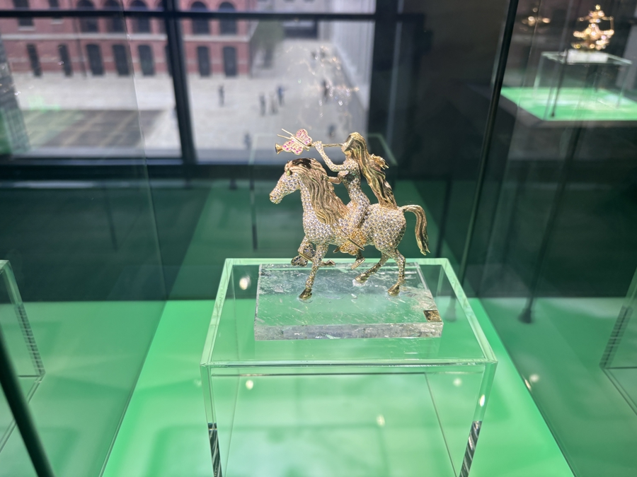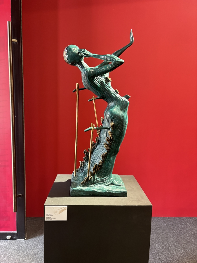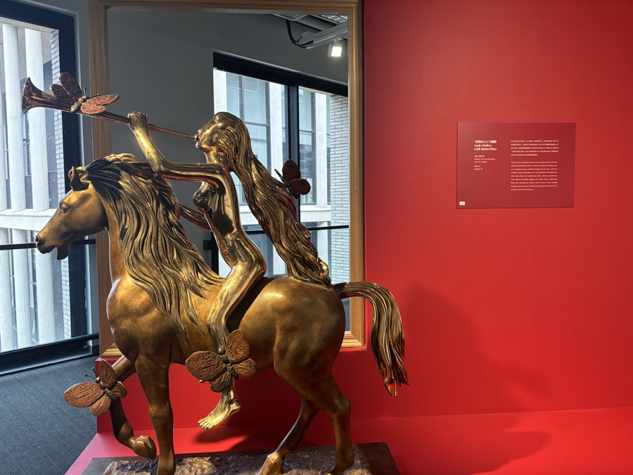 策展团队特别设计“由上至下”的观展动线,步入四楼展厅,率先映入眼帘的是雕塑作品《戈黛娃夫人与蝴蝶》,以青铜肌理呈现戈黛娃夫人的蜕变与勇气。