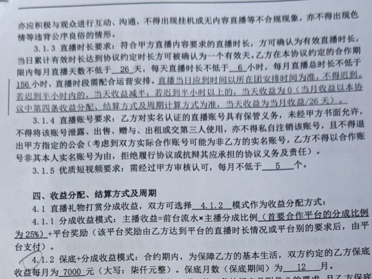 在社交媒体上,类似的维权和求助案例并不少见。许多主播在签约后才发现,所谓的“保底”“扶持计划”背后隐藏着复杂甚至不公平的合同条款,违约金动辄数十万元,直播时长、流量考核标准模糊,而在收益分配和礼物提成等部分,却常常夹带“霸王条款”。