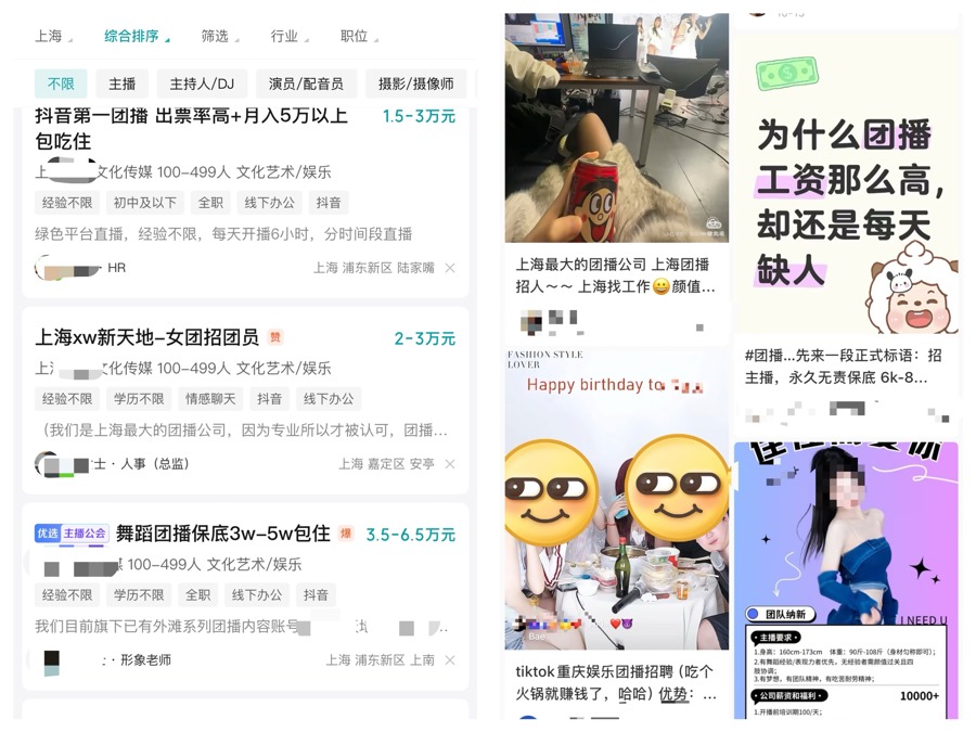 一位长期从事互联网直播运营的业内人士告诉记者,目前的团播大致可分为两种模式:一种是主打才艺展示的专业型团播,舞台专业、规模较大、设备和人员成本较高;另一种则是以“拉票变现”为主的团播,直播间造价成本低,主要是通过PK等方式赢得打赏。目前,在各大社交平台和招聘软件上活跃的,多是后者这类团播公司。它们用“零基础上镜”“颜值变现”“月入过万”“女团出道梦”等宣传语包装岗位,营造出一种轻松赚钱的职业氛围,吸引了不少年轻人入行。