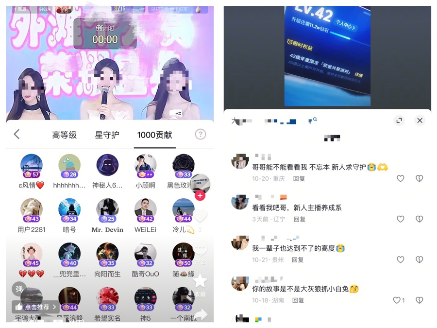 为博眼球,一些经纪人会要求主播穿更暴露的服装、做擦边动作。姿姿说,如果直播间流水不佳,还必须去其他直播间“拉大哥”,去主动私信或评论高等级粉丝,以维持团队收入。短视频平台直播中,粉丝等级越高,经济实力越强。“20级粉丝一般已消费(直播间刷票打赏)300多元,30级的消费约6000元,40级则消费7-8万元,50级粉丝的消费甚至超过40万元。主播通常需要重点维护30至40级粉丝,因为过低的等级可能缺乏消费刷票的能力,过高的等级则已经形成固定守护关系。”
