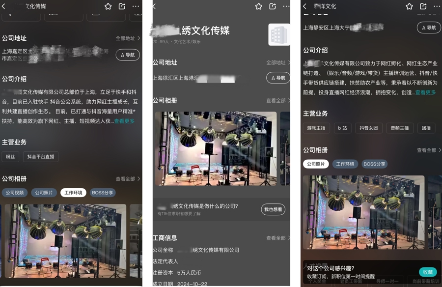 进一步查看招聘信息时,记者发现了一个现象:有些团播招聘职位虽然公司名称、办公地址各不相同,但详情页的展示图、直播间布景乃至Logo都高度相似。记者联系了这些职位的招聘人员,对方均自称是公司的“经纪人”,并解释道:“如果通知你的面试地址一样,就都是一个公司的,只是不同经纪人挂了不同的招聘链接。”一名经纪人称,团播公司都是这样批量注册账号、重复发布岗位,以此扩大曝光量、吸引更多求职者。