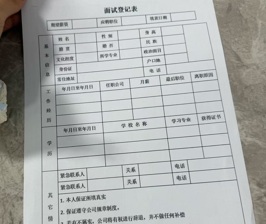 随后,记者以面试者身份前往了一家位于短视频产业园内的团播公司。对方发来的地址是园区内一家超市,到达约定的地点后,一名自称是经纪人的工作人员带着记者进入几十米开外的一栋大楼。前台办公桌上摆着一沓空白的登记表,但没有让记者填写。经纪人只问了句:“有直播经验吗?”听到否定的回答后,便简单介绍了一下公司,让记者去化妆试镜,并要求换上公司提供的吊带短裙。拍摄好照片后没两分钟,经纪人便告诉毫无舞蹈基础的记者:“面试通过了,条件可以,明天就能上班。”