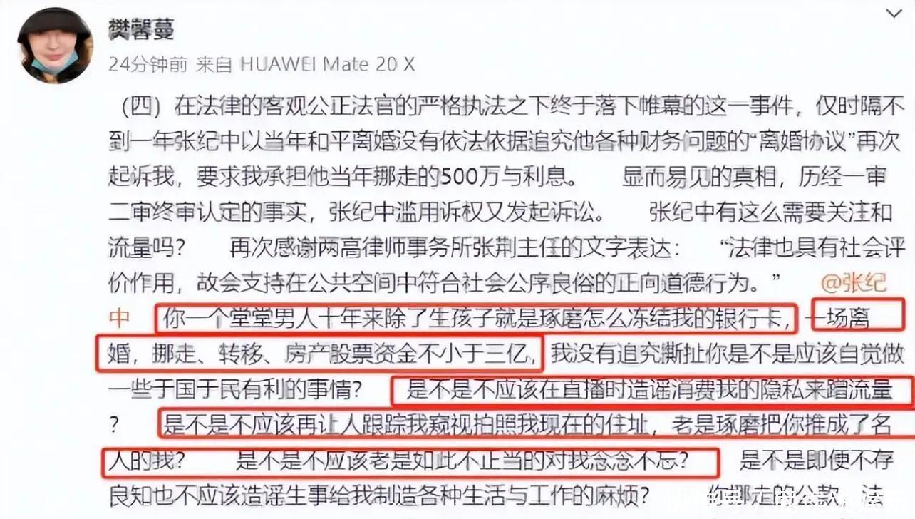 更狗血的是,之前已有民事判决要求张纪中归还公司500万,他却反手起诉要求重审。面对指控,张纪中一口咬定是前妻诬告,说离婚多年对方还持续骚扰。